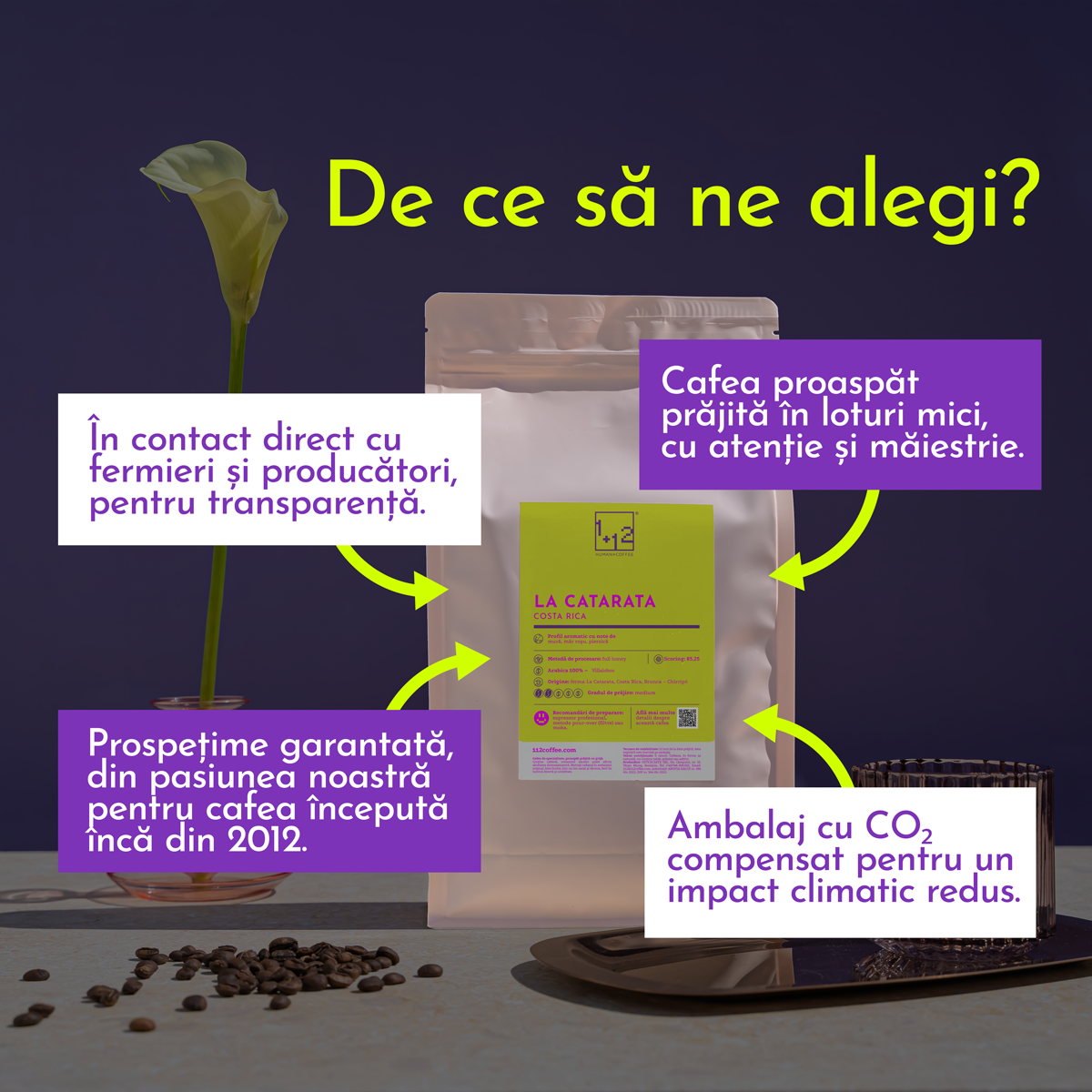 La noi, povestea cafelei de specialitate începe cu o selecție riguroasă a boabelor, continuă cu un proces de prăjire realizat cu cea mai mare atenție și este susținută de un angajament neclintit pentru calitate. Alegem cu mare grijă boabele de cafea și colaborăm exclusiv cu ferme de mici dimensiuni, angajate în practici sustenabile, capabile să asigure o calitate constantă și superioară a cafelei.