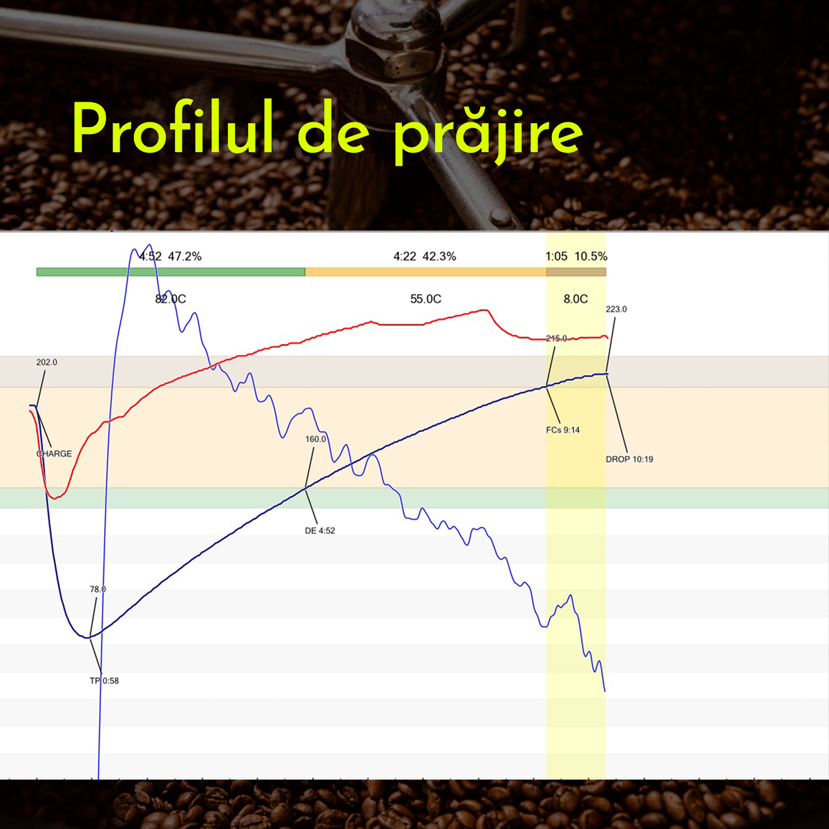 Pentru a elabora profilele de prăjire, utilizăm un prăjitor de cafea de laborator, cu o capacitate de 0,5 kg, furnizat de BESCA ROASTERS. Acest echipament avansat ne permite să ajustăm și să monitorizăm cu precizie parametri esențiali precum temperatura, viteza de rotație a tamburului și fluxul de aer.