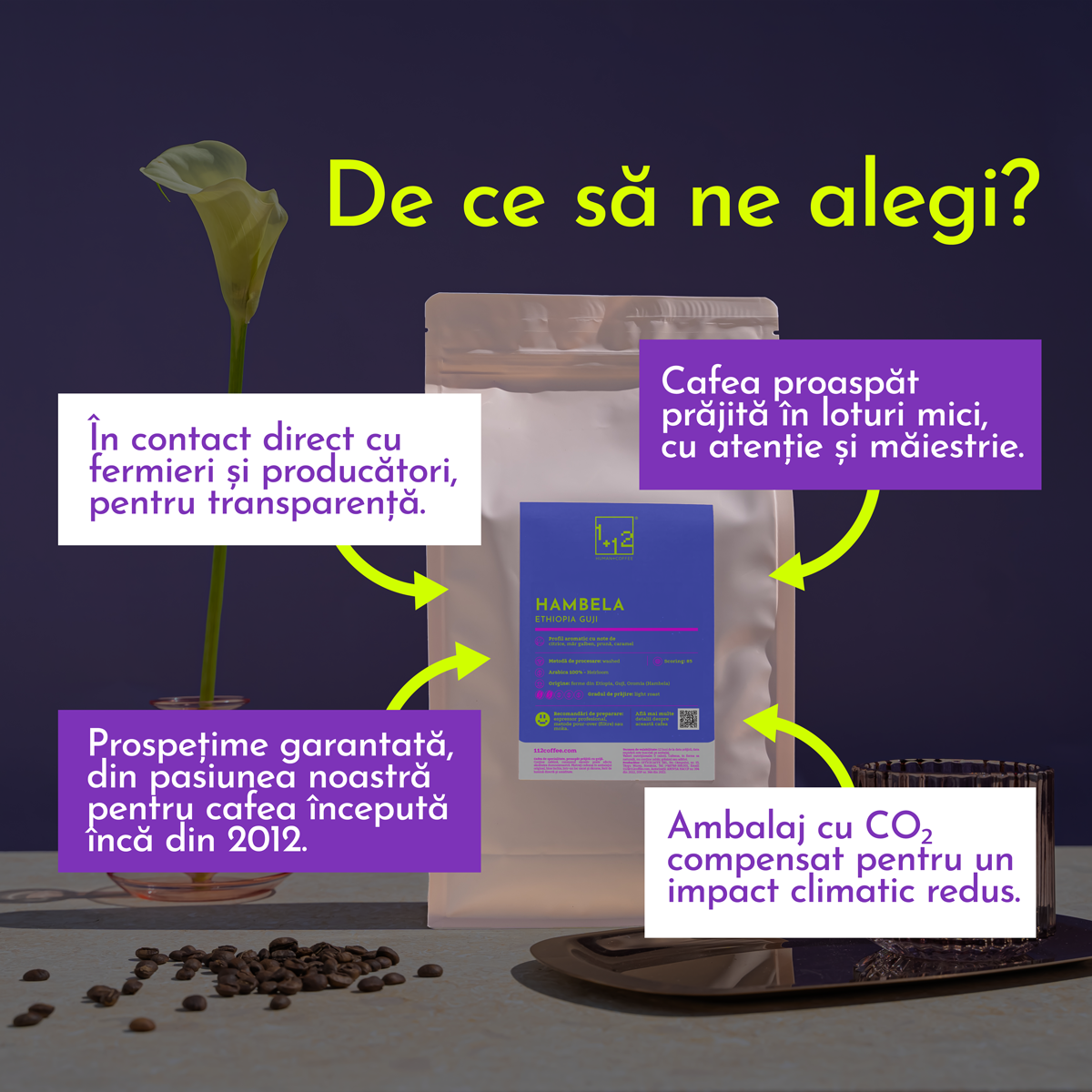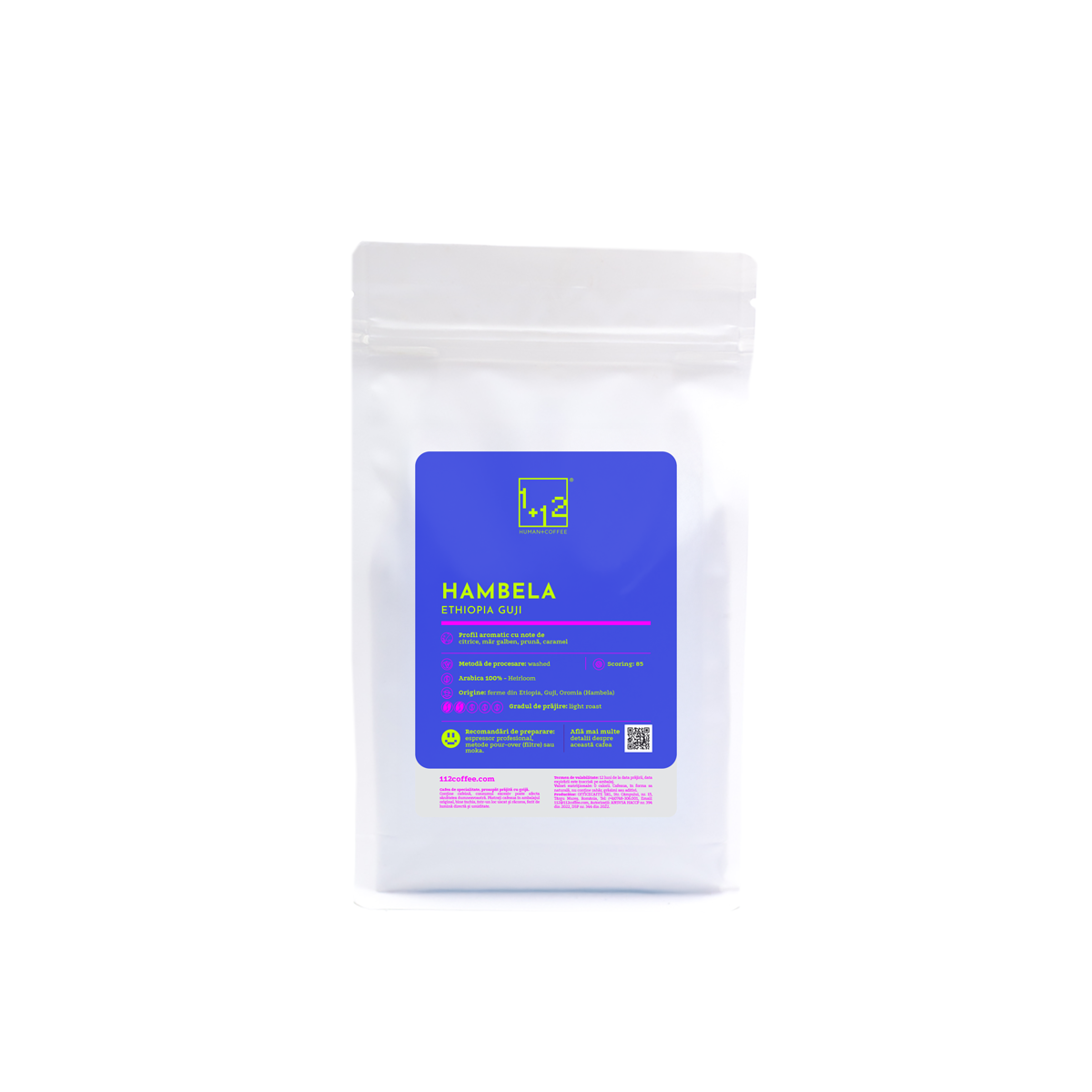 Hambela este un lot regional provenit din Guji, Oromia, una dintre cele mai apreciate zone cafeliere din Etiopia, recunoscută pentru profilurile sale florale, fructate și vibrante. Cafeaua este produsă de mici fermieri locali, care cultivă plantele în mod tradițional, pe parcele restrânse, situate la altitudini ridicate între 2000 și 2100 m.