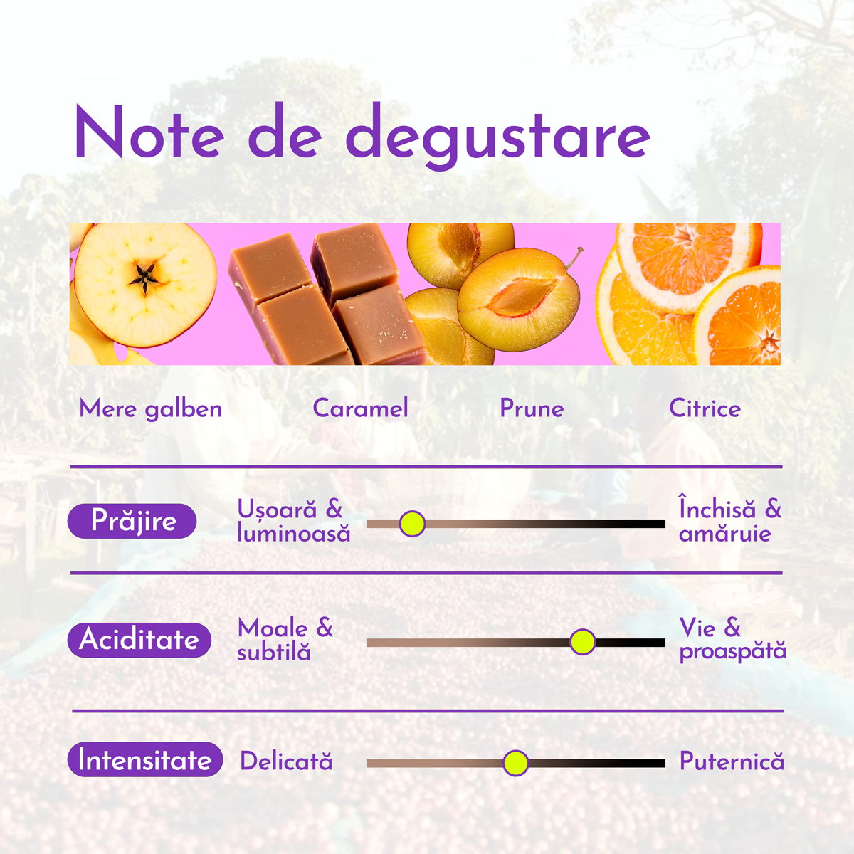 În ceașcă, această cafea se remarcă printr-un profil curat, echilibrat și suculent, cu o aciditate citrică bine definită. Notele de măr galben și fructe sâmburoase aduc prospețime și rotunjime, în timp ce accentele de caramel oferă un final dulce, neted și plăcut persistent.