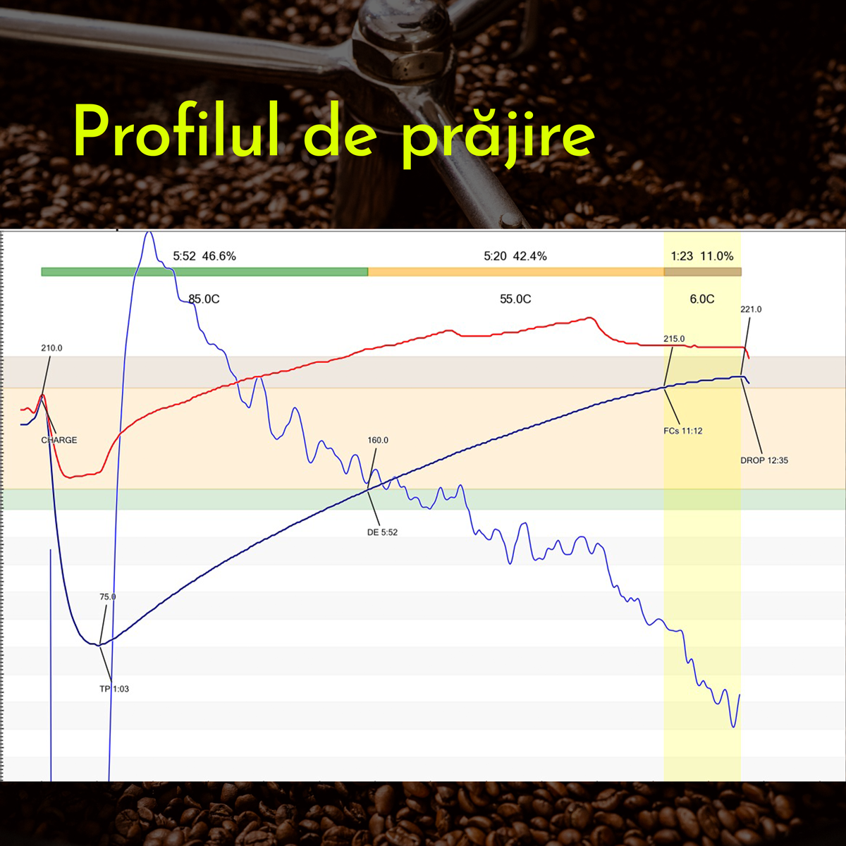 Pentru a elabora profilele de prăjire, utilizăm un prăjitor de cafea de laborator, cu o capacitate de 0,5 kg, furnizat de BESCA ROASTERS. Acest echipament avansat ne permite să ajustăm și să monitorizăm cu precizie parametri esențiali precum temperatura, viteza de rotație a tamburului și fluxul de aer.